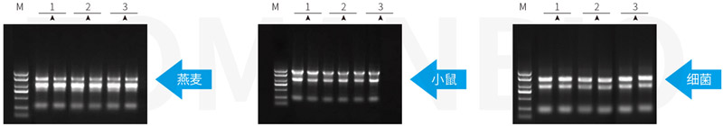 以上參考圖分別取50mg燕麥葉片,20mg小鼠肝臟和1ml細菌DH5α菌液各數(shù)份,組織進行液氮研磨處理,菌液離心收集細胞后,分別加入1ml Zomanbio RNApure 和 T、I公司相應(yīng)產(chǎn)品,按各自說明書進行RNA提取。洗脫體積分別為80μl、100μl、60μl。RNA電泳上樣量分別為5μl,1%瓊脂糖凝膠電泳。