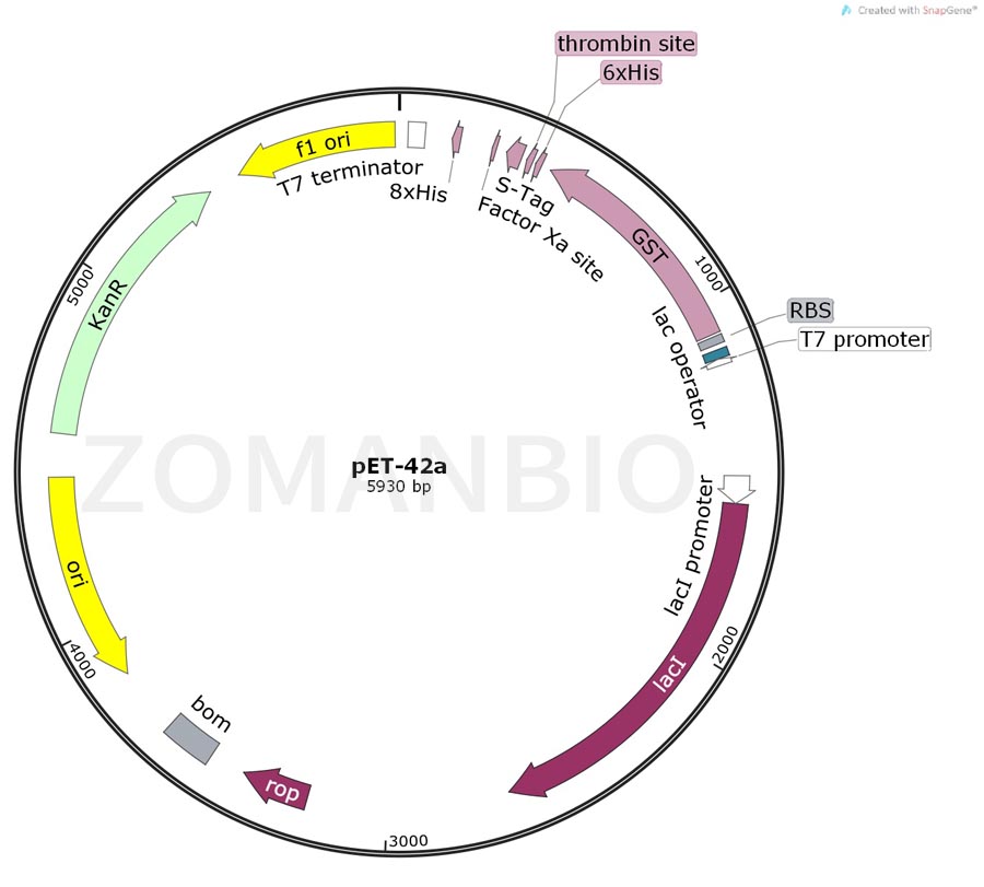 pET42系列載體是用來(lái)進(jìn)行克隆和高水平表達(dá)含有220個(gè)氨基酸的GST融合純化標(biāo)簽的蛋白表達(dá)載體。pET42a載體的單一的多克隆位點(diǎn)見(jiàn)上面的環(huán)狀質(zhì)粒圖譜。注意:載體序列是以pBR322質(zhì)粒的編碼規(guī)矩進(jìn)行編碼的,所以T7蛋白表達(dá)區(qū)在質(zhì)粒圖譜上面是反向的。T7 RNA聚合酶啟動(dòng)的克隆和表達(dá)區(qū)域在質(zhì)粒圖譜中也被標(biāo)注了出來(lái)。質(zhì)粒的F1復(fù)制子是被定向的,所以在T7噬菌體聚合酶的作用下,包含有蛋白編碼序列的病毒 粒子能夠產(chǎn)生,并啟動(dòng)蛋白表達(dá),同時(shí)蛋白表達(dá)將被T7終止子序列的作用下終止蛋白翻譯。把表達(dá)的基因插入到載體的PshAI限制性內(nèi)切酶位點(diǎn)時(shí),可以通過(guò)Factor Xa蛋白酶將融合表達(dá)的GST標(biāo)簽完全切除。 質(zhì)粒只保證關(guān)鍵序列正確,不保證表達(dá)效果。