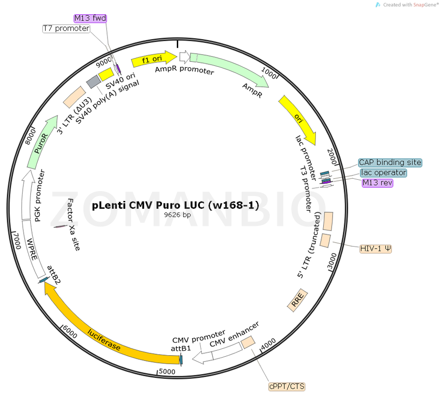 質(zhì)粒序列請下載:ZK805pLenti CMV Puro LUC (w168-1) 慢病毒表達質(zhì)粒.txt