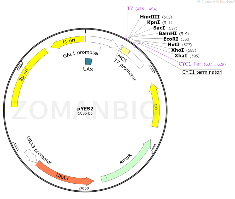 pYES2的是一個(gè)5.9 kb的載體,設(shè)計(jì)用來(lái)在釀酒酵母(Saccharomyces cerevisiae)中誘導(dǎo)表達(dá)重組蛋白。載體的特點(diǎn)在于基因插入載體的構(gòu)建簡(jiǎn)單,以及能夠使用原養(yǎng)型尿嘧啶進(jìn)行轉(zhuǎn)化株的篩選。