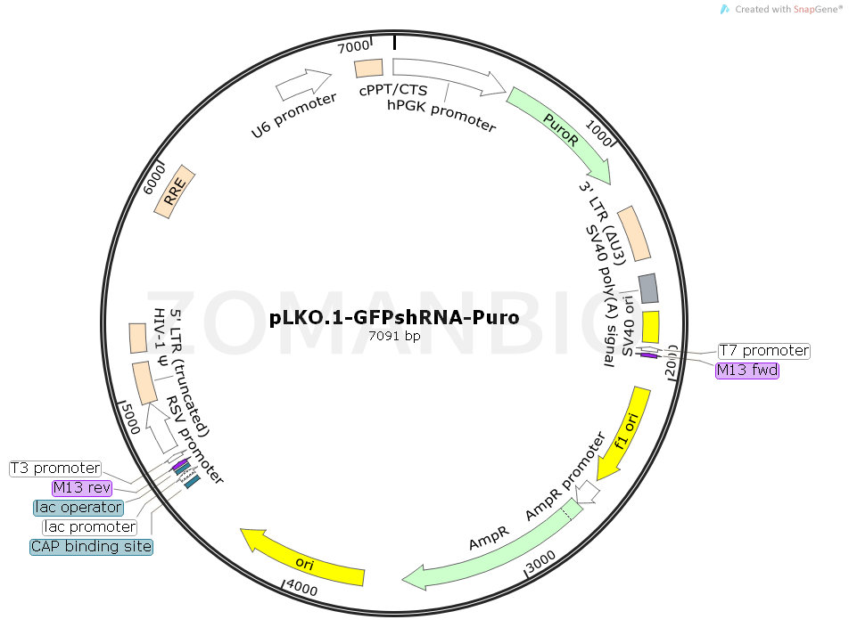 pLKO.1-GFPshRNA質(zhì)粒是在pLKO.1-Puro載體上克隆了一段GFPshRNA序列得到的一個哺乳細胞慢病毒RNA干擾質(zhì)粒。U6啟動GFPshRNA的轉錄,可特異性的干擾GFP蛋白的表達。該質(zhì)??勺鳛槠胀ㄟ^表達質(zhì)粒直接轉染哺乳細胞,也可包裝成慢病毒侵染細胞。質(zhì)粒本身帶有Puro篩選標記,可用嘌呤霉素篩選轉染后的細胞得到陽性克隆。