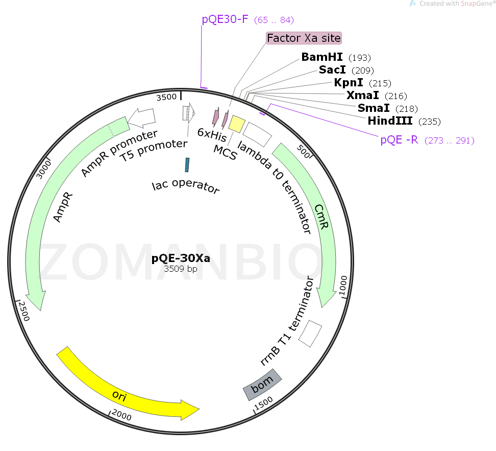 pQE-30Xa質(zhì)粒含有一個強大的噬菌體T5啟動子(被E.coli RNA 聚合酶識別),并含有兩個lac操縱子遏制模塊,用于在E.coli中嚴謹調(diào)控,高水平表達融合蛋白。在高水平lac遏制子存在的情況下,蛋白合成被有效阻斷,細胞毒素載體的穩(wěn)定性增強,pQE載體可以在重組蛋白的N端或C端帶上6×His標簽。
