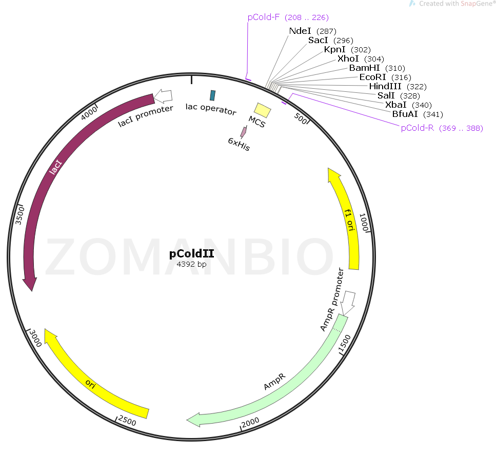 pColdII質(zhì)粒是利用冷休克基因CSPA啟動子設(shè)計高效率蛋白質(zhì)表達載體。在E.COLI啟動子下游處,插入了lac操縱子,以便嚴格控制表達。此外,5’非翻譯區(qū)(5’UTR),翻譯增強元件(TEE),His標簽序列,Xa因子切割位點和多克隆位點(MCS)位于CAPS啟動子的下游。當培養(yǎng)溫度切換到低溫時,大腸桿菌暫時停止生長,大部分的大腸桿菌蛋白質(zhì)表達減少,但是一類稱為冷休克蛋白的蛋白質(zhì)被特異性誘導表達。