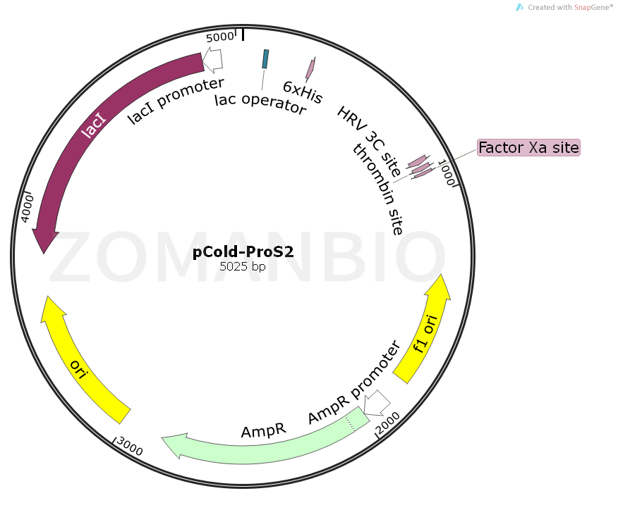 pCold ProS2 DNA 是一種融合的冷休克表達(dá)載體,使用來源于革蘭氏陰性菌Myxococcus xanthus中的Protein S作為可溶性標(biāo)簽。這種Protein S存在于粘細(xì)菌的孢子衣中,由173個氨基酸殘基組成,是一種非常穩(wěn)定的可溶性蛋白質(zhì)。將兩個Protein S的N-末端結(jié)構(gòu)域串聯(lián),再結(jié)合ProS2 Tag的作用,就能使融合目的蛋白的穩(wěn)定性和可溶性得到提高。此外,由于目的蛋白和ProS2-Tag的相互作用性很低,因此可以將二者有效分離。pCold ProS2 DNA Vector在cspA啟動子的下游插入了5’非編碼區(qū)(5’-UTR)、翻譯增強(qiáng)元件(TEE)、His-Tag序列、ProS2-Tag和多克隆位點(diǎn)(MCS)。在ProS2-Tag和多克隆位點(diǎn)(MCS)之間主要是HRV3C Protease、Thrombin和Factor Xa的切斷位點(diǎn),用來消除融合蛋白質(zhì)的標(biāo)簽。此外,在cspA啟動子下游還插入了lac operator,可以嚴(yán)格調(diào)控目的基因的表達(dá)。由于本制品的啟動子是大腸桿菌來源的,所以大部分大腸桿菌都可以作為表達(dá)宿主使用??傊?,pCold ProS2 DNAVector提供的冷休克技術(shù),能夠促進(jìn)蛋白質(zhì)的正確折疊,增加目的蛋白質(zhì)的可溶性,對于一些棘手的目的蛋白質(zhì)的表達(dá)是一個很好的選擇。
