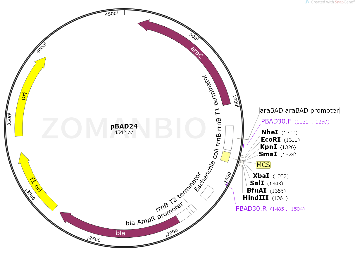 pBAD24質(zhì)粒是衍生于pBR322載體。載體設(shè)計用來在大腸桿菌中進行可調(diào)節(jié),劑量依賴性的表達和純化重組目的蛋白。使大腸桿菌araBAD啟動子(pBAD)增強了大腸桿菌重組蛋白可溶性表達的水平。pBAD/His和pBAD/Myc-His系列載體上的調(diào)節(jié)蛋白AraC能夠調(diào)控pBad啟動子。