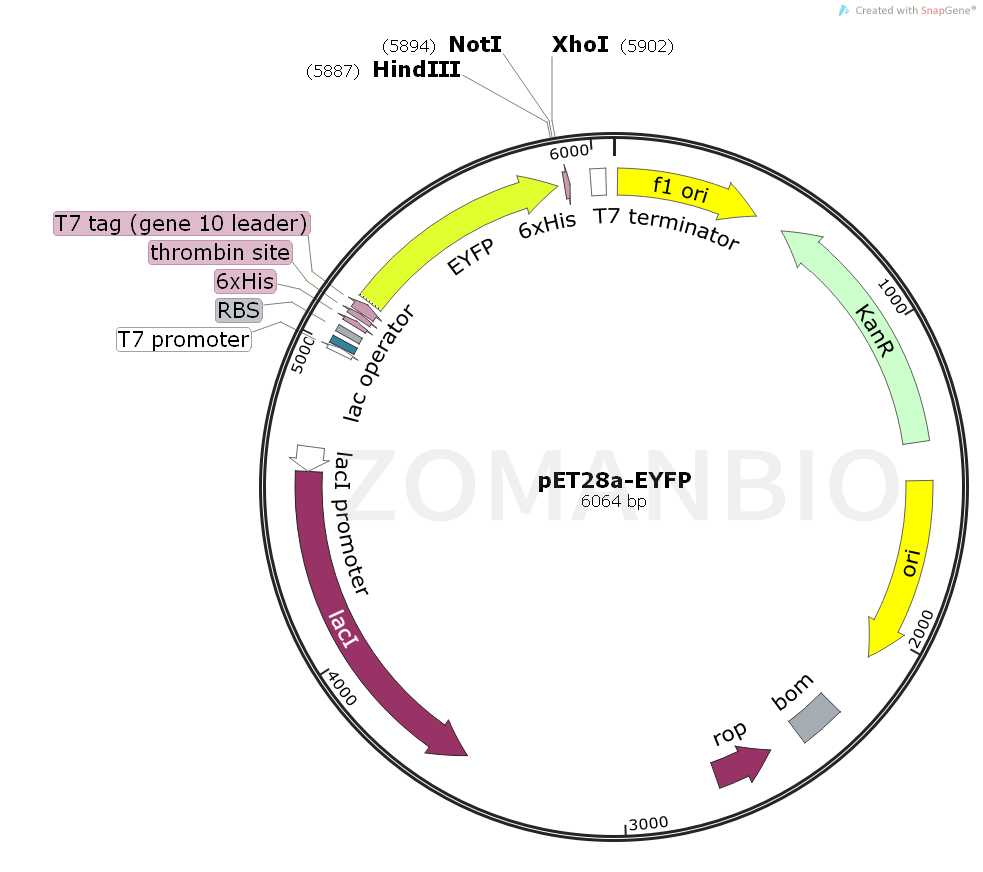 pET28a-EYFP質(zhì)粒是一種原核表達(dá)載體,C端含有一個(gè)6×His標(biāo)簽,N端含有一個(gè)thrombin位點(diǎn)、6×His標(biāo)簽、T7標(biāo)簽和EYFP標(biāo)簽。該質(zhì)粒含有多個(gè)常用的酶切位點(diǎn),便于不同基因克隆。表達(dá)由宿主細(xì)胞提供的T7 RNA聚合酶誘導(dǎo),目的基因被克隆到質(zhì)粒載體上,受噬菌體強(qiáng)轉(zhuǎn)錄及翻譯信號(hào)控制。