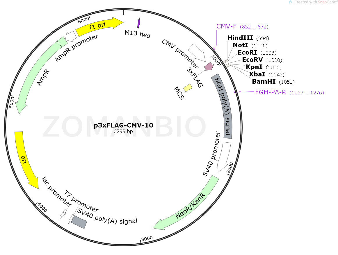 p3×FLAG-CMV-10表達載體是用于在哺乳動物細胞中建立N-3×FLAG融合蛋白的瞬時或穩(wěn)定細胞內的pCMV5表達載體的升級版。該載體在多克隆區(qū)域上游編碼三個相鄰的FLAG表位(Asp-Tyr-Lys-Xaa-Xaa-Asp)。這導致使用FLAG抗體的檢測靈敏度增加。第三個FLAG表位包括腸激酶識別序列,允許從純化的融合蛋白切割3×FLAG肽。