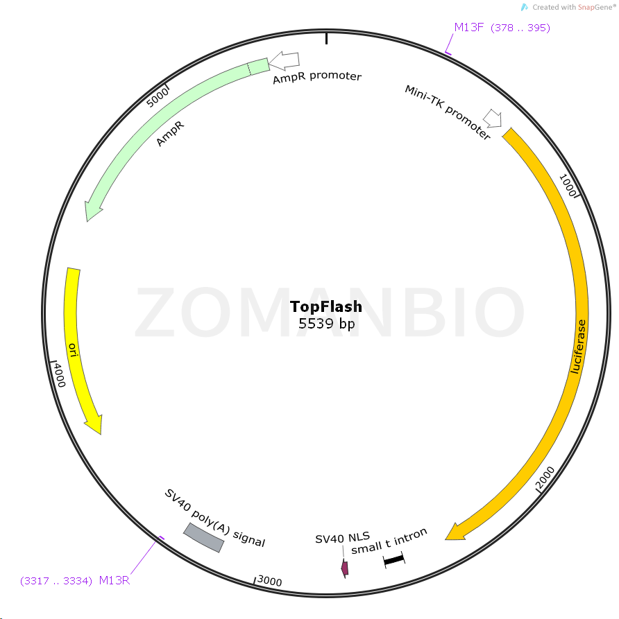 Transfection grade T cell factor (Tcf) reporter plasmid containing three copies of the Tcf binding site (wt) upstream of the Thymidine Kinase (TK) minimal promoter and Luciferase open reading frame. FOPFLASH containing mutated Tcf binding sites is also available as a negative control.