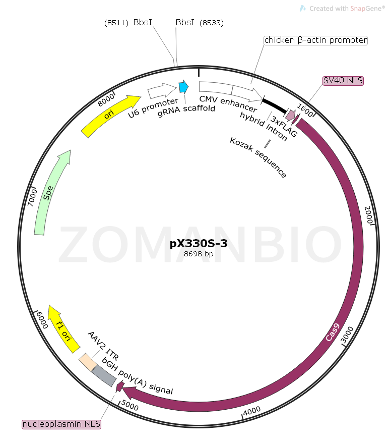 pX330S-3是一個(gè)哺乳細(xì)胞CAS9和gRNA表達(dá)質(zhì)粒。
