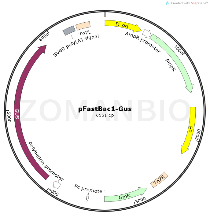 pFastBac1-Gus是一個昆蟲細胞桿狀病毒胞內(nèi)表達質粒。