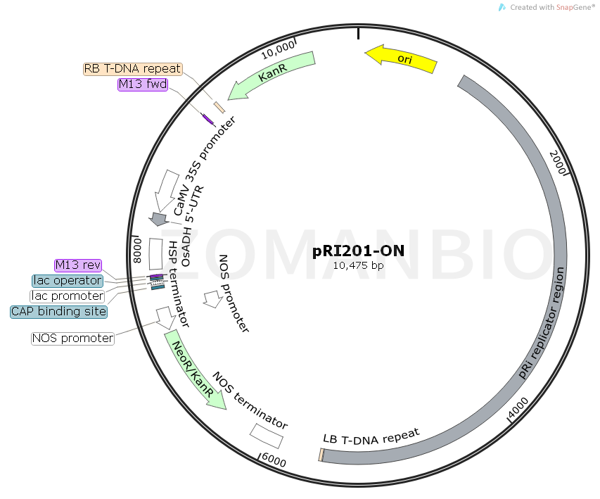 The Ri Plasmid pRI201 binary vector series offers two types of vectors: pRI 201-AN DNA and pRI 201-ON DNA. pRI 201-AN DNA contains an Arabidopsis ADH-derived 5' UTR (AtADH 5'-UTR) and is suitable for dicotyledonous plant transformation. pRI 201-ON DNA contains a rice ADH-derived 5' UTR (OsADH 5'-UTR) and is suitable for monocotyledonous plant transformation. The pRI 201-AN DNA and pRI 201-ON DNA binary vectors for plant transformation have a mutant-type replication origin (Ri ori) from the Rhizobium rhizogenes Ri plasmid. These vectors also contain a replication origin (ColE1 ori) derived from the pUC plasmid; the ColE1 ori allows high copy number replication in E. coli. The vectors' multiple cloning site, located near the right border (RB) of T-DNA, allows stable target gene integration into the plant chromosome.