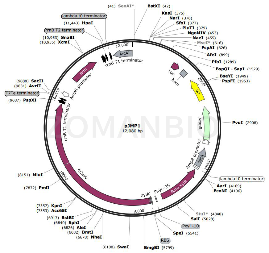 pJMP1質(zhì)粒是一個(gè)枯草桿菌基因編輯質(zhì)粒。Bacillus subtilis dCas9 expression vector; integrates into lacA/ganA。dcas9 was PCR-amplified from pdCas9-bacteria (Addgene #44249) using primers containing BamHI-compatible BsaI sites, digested with BsaI, then ligated into plasmid pAX01 digested with BamHI to generate pJMP1。